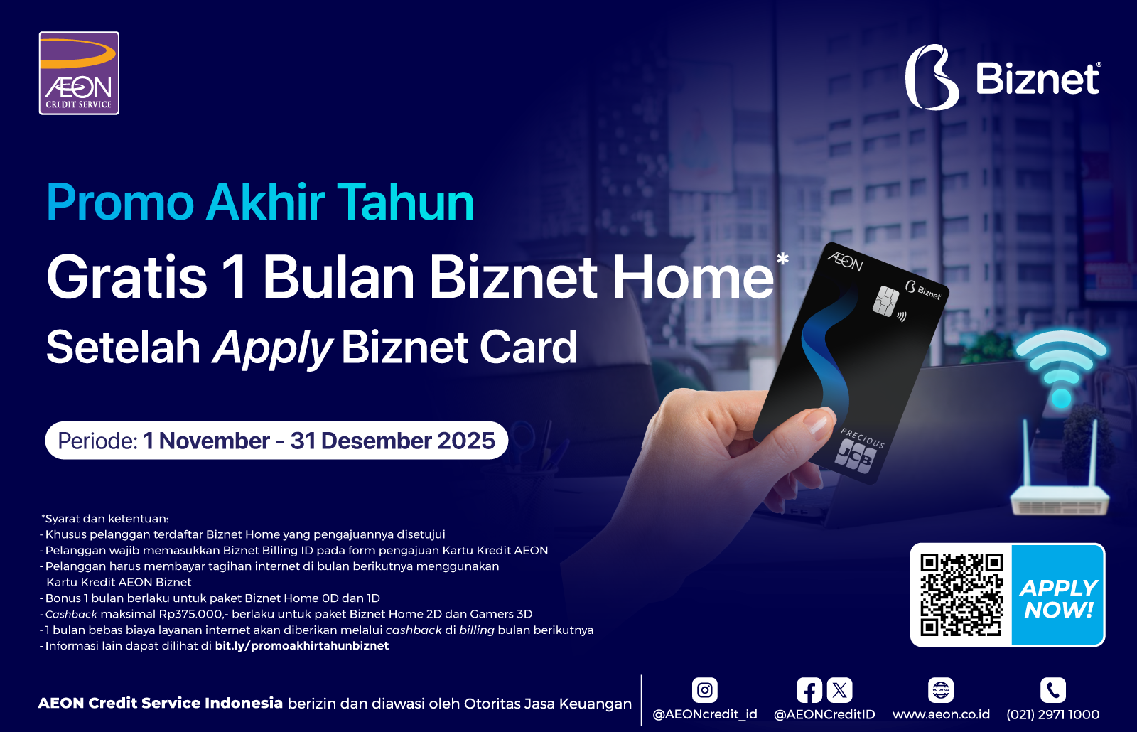 Untuk info lebih lanjut mengenai ketentuan promo, bisa dilihat di bit.ly/promoakhirtahunbiznet. atau hubungi AEON Customer Service di 021 29711000 dan email ke customercare@aeon.co.id
