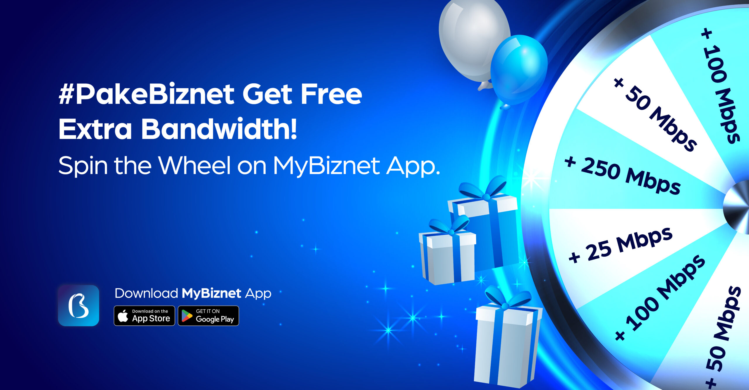To bring even more value to your experience, Biznet introduces the Spin Wheel feature in the MyBiznet app, available for all customers. The Spin Wheel can be played once on the 1st, 11th, and 21st of every month, giving you a chance to win extra bandwidth of up to 250 Mbps for 7 days. Download the MyBiznet app now on Google Play and the App Store and grab your chance to win!